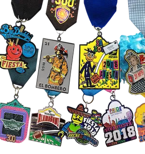school and fundraiser medals including Fiesta Fun Run, STEM, dance team, and charity events